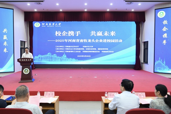 张全勇致辞,他指出,河南省畜牧龙头企业在创新驱动、科教兴省、人才强省战略指引下焕发出新动能,成为推动产业进步与转型升级的强大引擎,为全国畜产品稳产保供和经济社会发展作出了重要贡献。他期待,通过此次活动打通服务企业‘最后一公里’,推动校企资源共享、深度互动,促进科技创新链、企业扶优链、人才成长链协同发力,助力产学进一步融合发展。他呼吁农大学子努力为行业发展注入新活力,成为河南畜牧业高质量发展的骨干和栋梁。