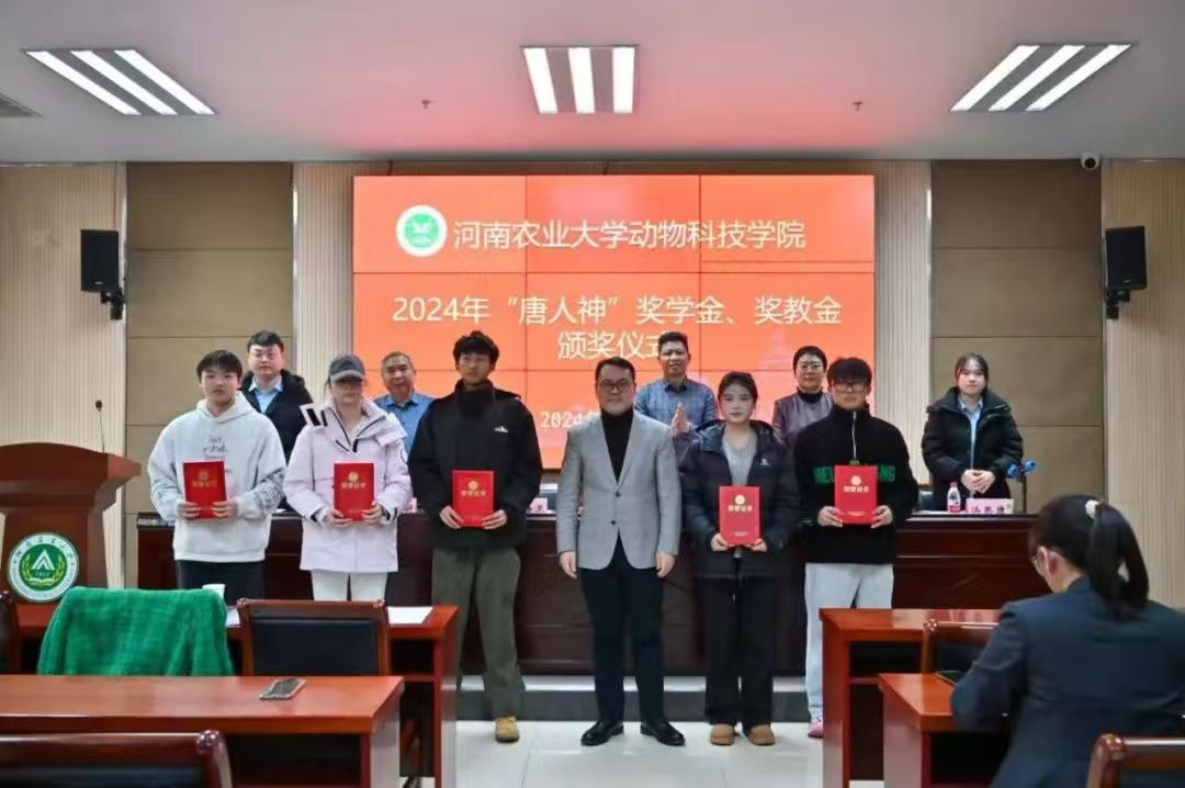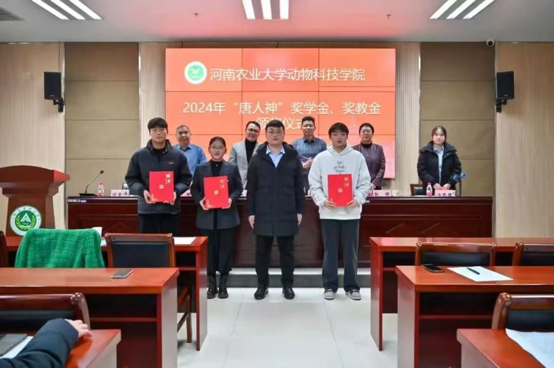 关于颁发2024年“唐人神”奖学金、奖教金的决定》,随后,企业领导赵海卫为获奖师生依次颁奖并合影留念。