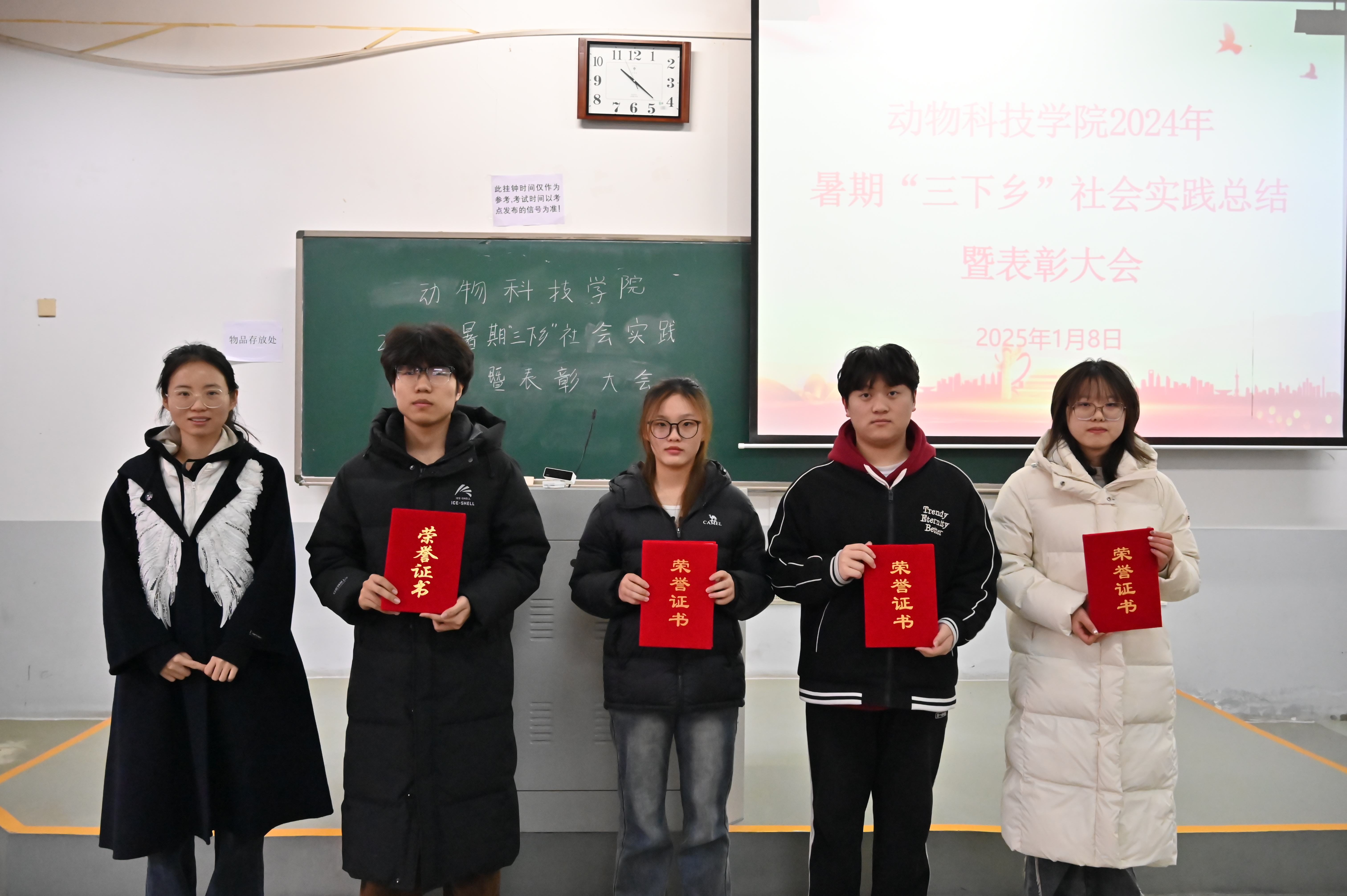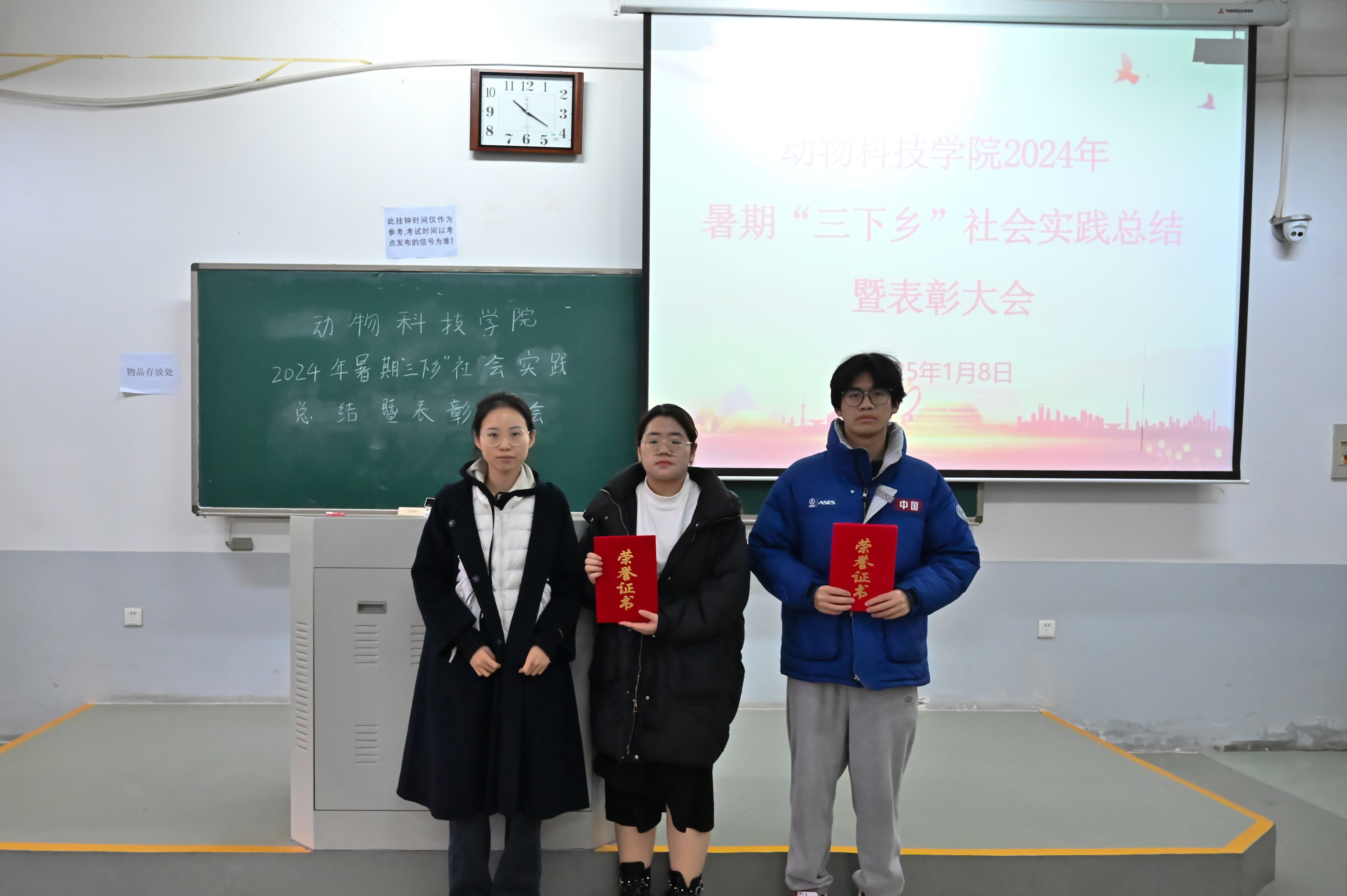 于龙子湖校区繁塔楼E113教室举办2024年暑期“三下乡”社会实践总结暨表彰大会,辅导员赵姝灿、杨超然及22、23级学生代表参会,24级学生线上参会。