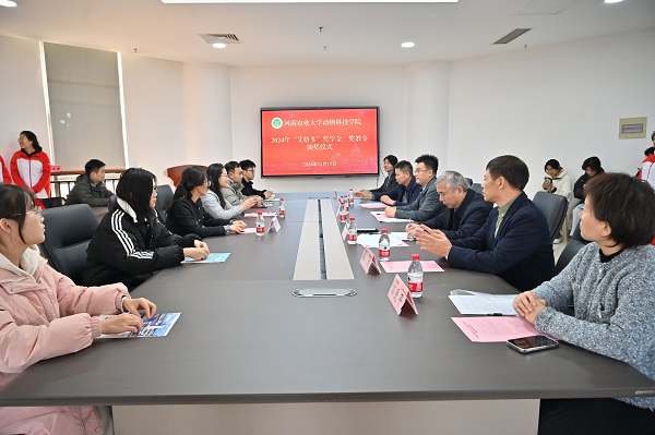 于龙子湖校区第一实验楼南501会议室举行2024年“艾格多”企业奖学金、奖教金颁奖仪式。河南艾格多科技集团有限公司总裁任振东与人资行政总监孙爱平、校友办主任胡明忠、绅士漫画