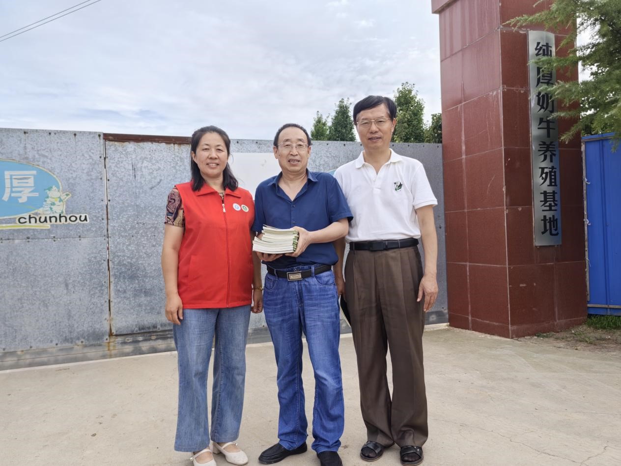 一直有着深厚的合作关系。服务团成员先到达纯厚奶牛场,在场区人员陪同下,从牛场布局,生产流程,养殖模式,牛奶销售,经济效益等方面进行了现场考察和访谈,发现挤奶厅缺乏防暑降温措施,饲养管理不够精细化等,老师们对场方存在的问题和面临的困境进行了解答和指导,最后向场区领导和技术员赠送了科普图书资料。