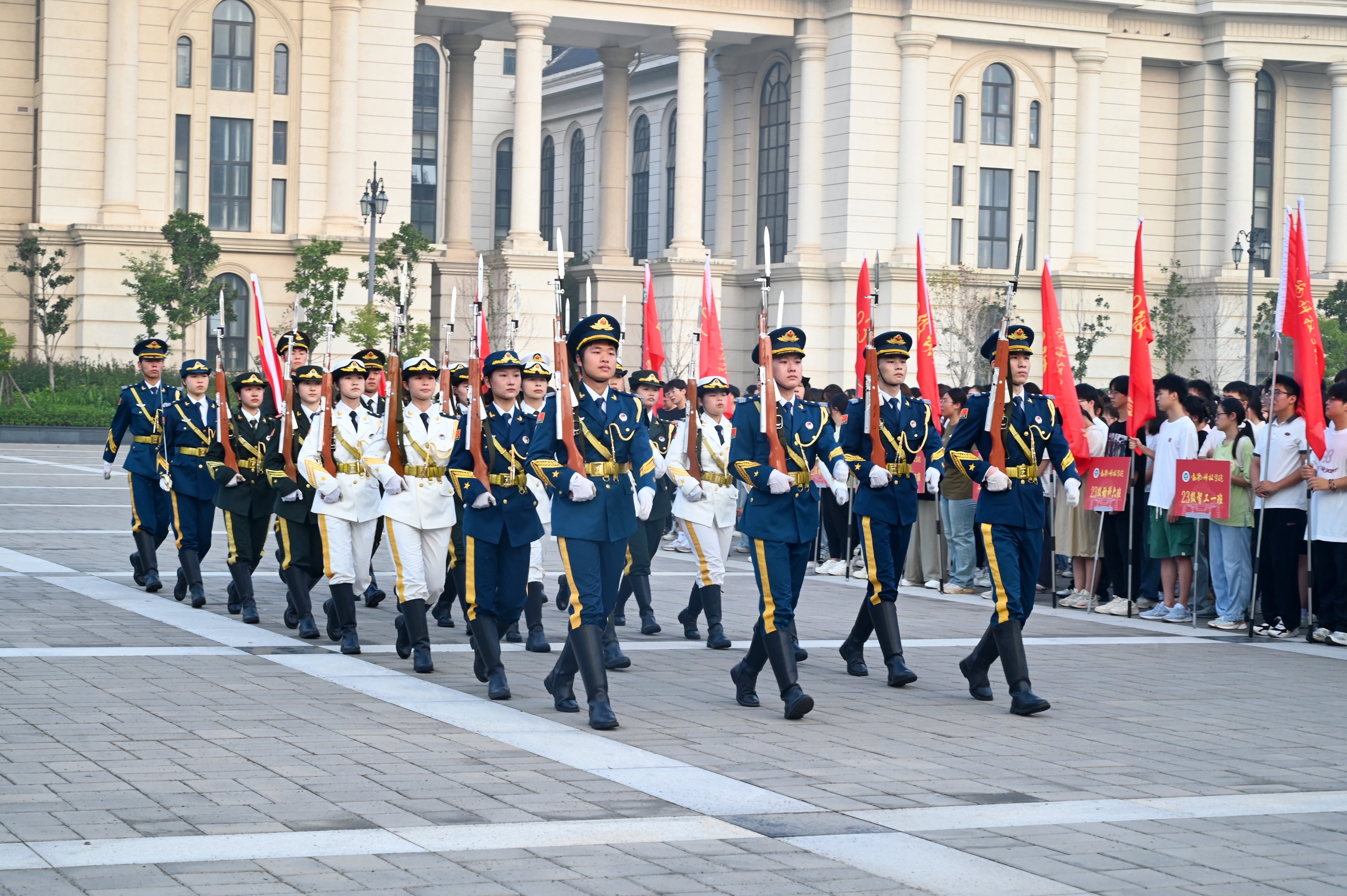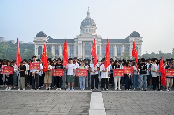 于龙子湖校区举行“七十五载春华秋实 砥砺前行共绘新篇”秋季新学期升国旗仪式,学院全体师生参与活动,仪式由院党委副书记郭娟主持。