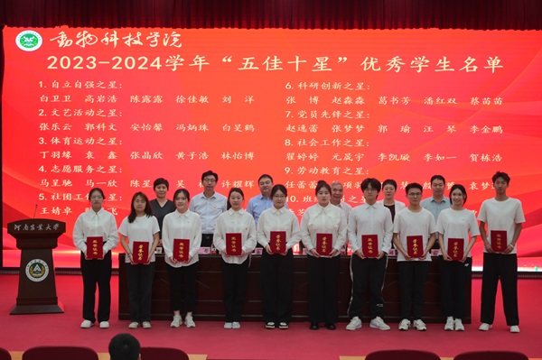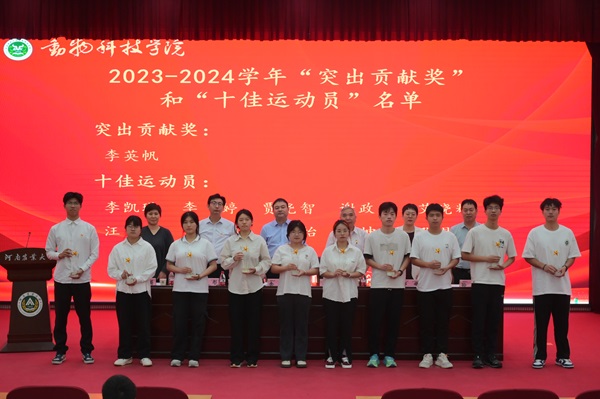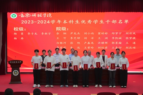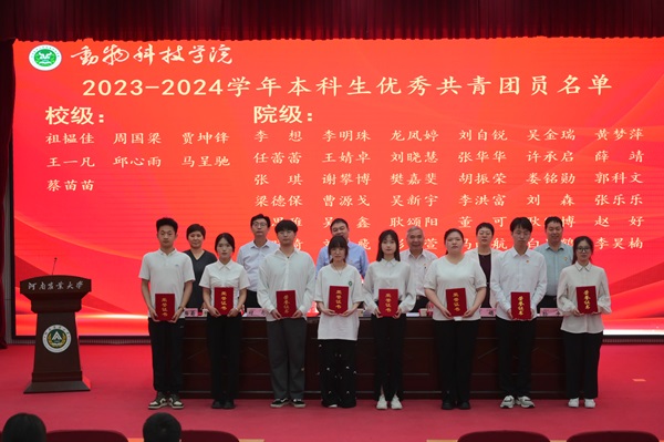 于龙子湖校区繁塔楼大教室一举行新党员入党宣誓暨2023-2024学年学生工作表彰大会,院党委书记余磊、院长李明、农大牧原联合产业研究院院长兼学院副院长付彤、院党委副书记郭娟、副院长酒梅菊、副院长孙宇及学生代表参会,会议由郭娟主持。