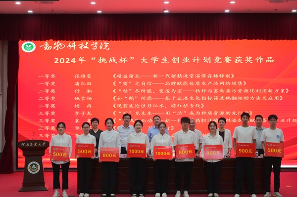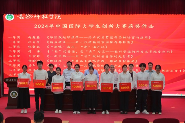 关于表彰2024年中国国际大学生创新大赛获奖作品的决定》,与会领导为获奖集体及个人依次颁奖并合影留念。