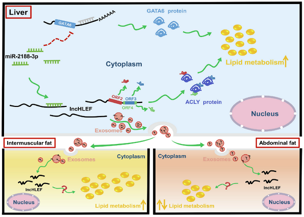 肝脏是鸡脂质代谢的主要器官,但有关鸡肝脏脂质代谢的调控机制,特别是长链非编码RNA(lncRNA)在这一过程中的作用机制依然不清。为此,课题组通过对产蛋前期和高峰期母鸡肝脏全长转录组分析,系统研究了鸡肝脏lncRNA与脂质代谢的关系,并鉴定出一个可促进肝细胞脂滴形成、甘油三酯和总胆固醇合成的基因间lncRNA lncHLEF。体外试验分析表明,lncHLEF不仅可以作为竞争性的内源性RNA调节miR-2188-3p/GATA6轴,还可编码3个功能小肽直接增强ACLY蛋白的稳定性,进而促进脂质合成。腺相关病毒介导的肝特异性lncHLEF过表达活体试验表明,lncHLEF可促进肝脏脂质合成,同时通过外泌体形式转运lncHLEF,从而促进肌内脂肪(IMF)沉积,但不改变腹部脂肪(AbF)沉积(图1)。该成果 “LncHLEF promotes hepatic lipid synthesis through the miR-2188-3p/GATA6 axis and encoding peptides, and enhances intramuscular fat deposition via exosomes” 以研究论文形式在线发表于国际著名期刊《International Journal of Biological Macromolecules》(中科院一区)。绅士漫画