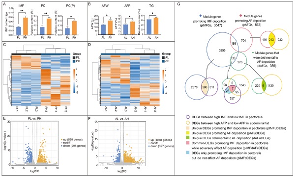 在鸡肉生产中,肌肉内脂肪(IMF)沉积有利于肉质的提升,而腹部脂肪(AbF)沉积却导致饲料浪费和环境污染。然而,IMF和AbF之间脂质组成的异质性和差异性沉积机制仍不清楚。课题组首先利用非靶向脂质组学技术,对地方鸡固始鸡胸肌IMF和AbF的组成成分进行了分析,共检测到423个鸡IMF和AbF之间的差异脂质分子(DLM),并确定了28种导致IMF和AbF异质沉积的主要DLM,通过加权基因共表达网络分析(WGCNA)将转录组与主要DLM进一步整合分析,发现了5个关键基因集,包括386个促进胸肌IMF沉积的特异性基因、213个促进AbF沉积的特异性基因、6个对AbF沉积不利的基因、7个促进胸肌肉IMF沉积但对AbF沉积有不利影响的基因以及28个仅促进胸肌IMF沉积但对AbF沉积没有影响的基因。这些发现为理解IMF和AbF差异性异沉积提供了新视角,并为通过育种选择提高肉质提供宝贵的信息资源(图4)。该成果 “Integrated LC/MS-based lipidomics and transcriptomics analyses revealed lipid composition heterogeneity between pectoralis intramuscular fat and abdominal fat and its regulatory mechanism in chicken” 以研究论文形式在线发表于国际著名期刊《Food Research International》(中科院一区)。绅士漫画