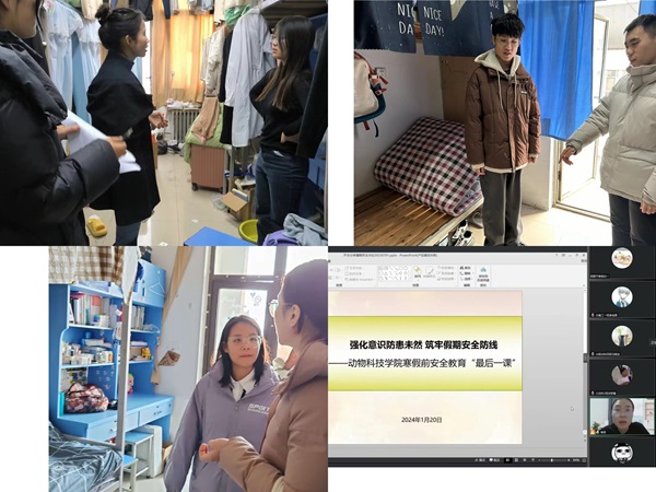 领导带队全方位深入学生宿舍、实验室、自习室等进行安全隐患排查和处置,听取学生诉求,传递学院关怀;院团委召开寒假前安全教育“最后一课”,传达校、院工作精神,从宿舍、居家、网络、实习实践安全等方面作出温馨提醒,协力夯实安全基础,筑牢稳定基石。