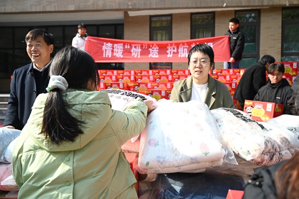 现场,贾磊与考研学生进行亲切交流,表示2020级是伴随着学院成立而来的第一届学生,对学院而言意义特殊,非常珍贵,勉励大家勇敢追梦,一战成硕,学院将全力为大家保驾护航。他对大家努力备考的状态表示欣慰,提醒学生要做到系统地复习考研知识,及时查漏补缺,最后祝愿大家成功上岸,心想事成。随后由领导老师亲自为每位考研学生发放精心准备的面包、毛毯等暖心物资,并鼓励大家要全力以赴、奋战到底,师生亲切交谈,友好互动。活动现场气氛热烈,学生们深刻地感受到学院的温暖,脸上洋溢着开心的笑容,纷纷对送来温暖的领导老师表以诚挚感谢。同时,考虑天气日渐寒冷,学院将会加大物资份额,将毛毯分批私下送至困难学生手中,帮助困难学生温暖过冬。