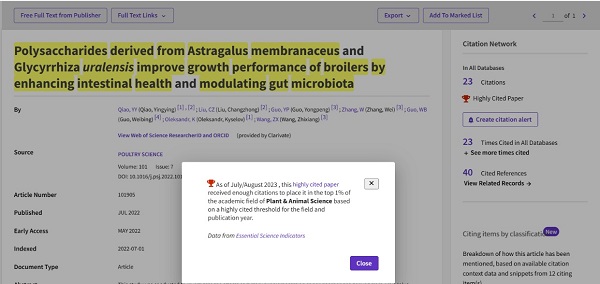 王志祥教授以通讯作者在动物科学领域知名期刊Poultry Science上发表的研究论文《Polysaccharides derived from Astragalus membranaceus and Glycyrrhiza uralensis improve growth performance of broilers by enhancing intestinal health and modulating gut microbiota 》入选ESI高被引论文(Highly Cited Paper)。该项研究发现黄芪多糖和甘草多糖能够通过改善肠道健康和调节肠道菌群进而提高肉鸡生产性能,本研究为黄芪和甘草这两种重要药用植物在畜禽健康养殖上的开发利用提供了重要科学依据,该论文发表一年以来,累计他引次数达到23次。