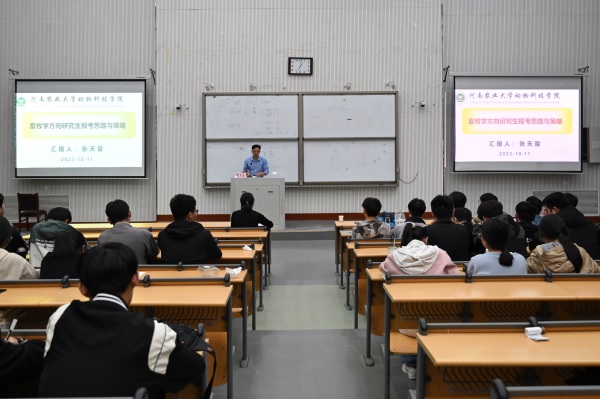 张天留聚焦于⟪畜牧学方向研究生报考思路与策略⟫,从学科发展背景、人才培养模式、考研常见问题、建议与期望四个方面为现场学生进行专业指导分析,帮助学生深度剖析考研相关问题。他向学生详细解读了“什么是研究生”、“学硕和专硕的区别”、“考研注意事项”及“优秀研究生的标准”等问题,让同学们对考研择校等有了更深层次的了解。最后他祝愿在座同学能够梦想成真、成功上岸。互动环节,同学们纷纷提出了关于备考过程中的困惑,张天留逐一进行详细解答,现场交流气氛热烈。
