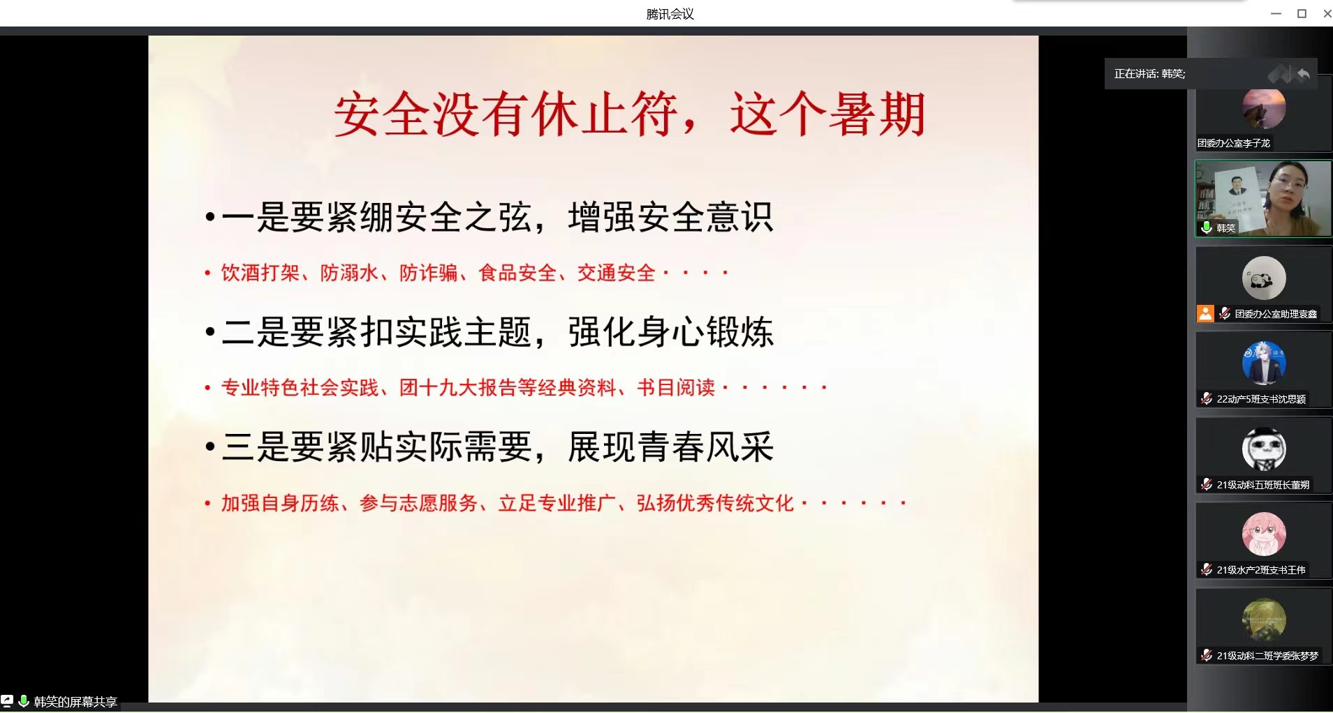 本网讯(通讯员 韩笑)为传达落实学校相关工作精神,切实提高师生安全保障意识,确保每位同学都能度过一个安全、愉快、充实的假期,7月1日,学院通过线上会议的形式举行2023年暑期安全稳定会议,全体班委参会,会议由组织员兼团委书记韩笑主持。
