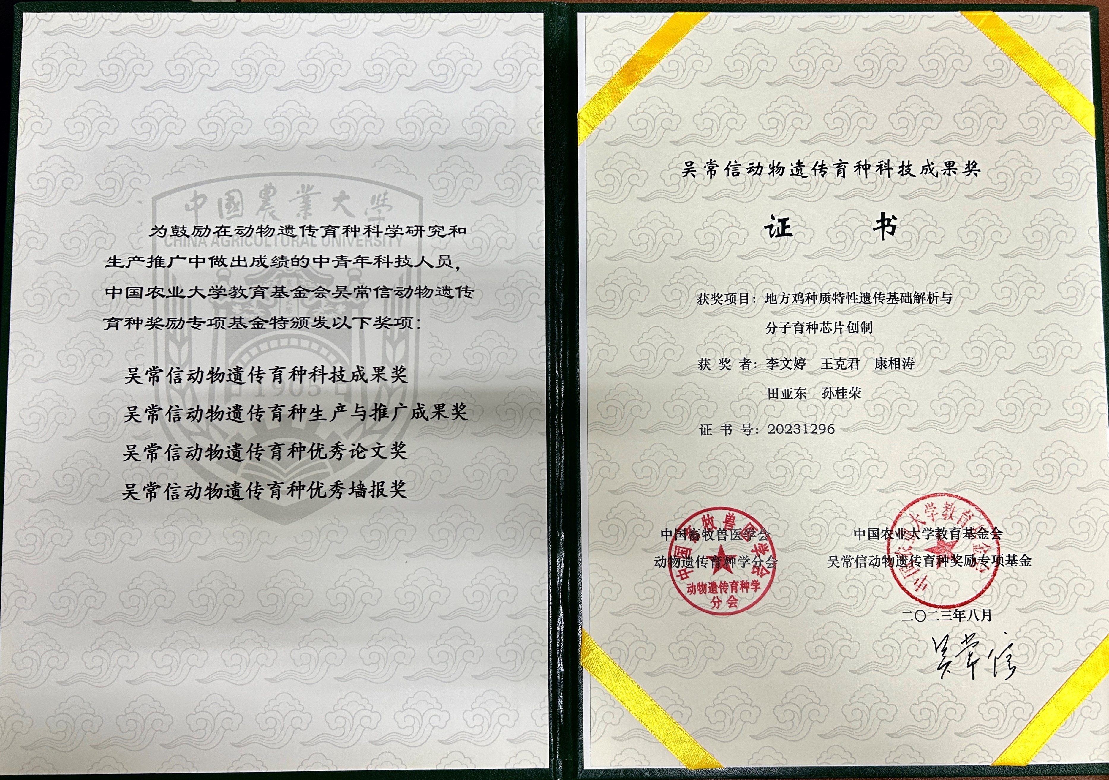鸡种质特性遗传基础解析与分子育种芯片创制》荣获第八届吴常信动物遗传育种奖科技成果奖(每届2项),该成果主要针对我国家禽种业振兴需求,构建国际首个家禽泛基因组平台,解析家禽生长性状主效基因IGF2BP1原因突变,研发了地方鸡专用基因组系列芯片“神农1号”,搭建了地方鸡种质特性遗传基础解析与分子设计育种的底盘技术体系。硕士生高超群获青年学者旅行奖、硕士生职毅豪获动物遗传育种优秀论文奖。