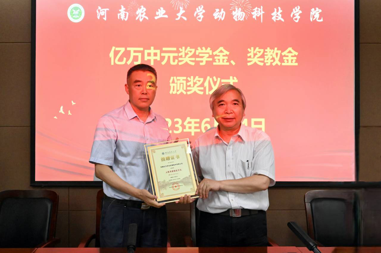 在龙子湖校区实验楼321会议室举行了2023年“亿万中元”企业奖学金、奖教金颁奖仪式,亿万中元有限公司董事长郑文革、院长李明、副院长付彤、动物营养与饲料工程系主任陈文出席会议,全体获奖师生及学生代表参加了活动。活动由组织员兼团委书记韩笑主持。