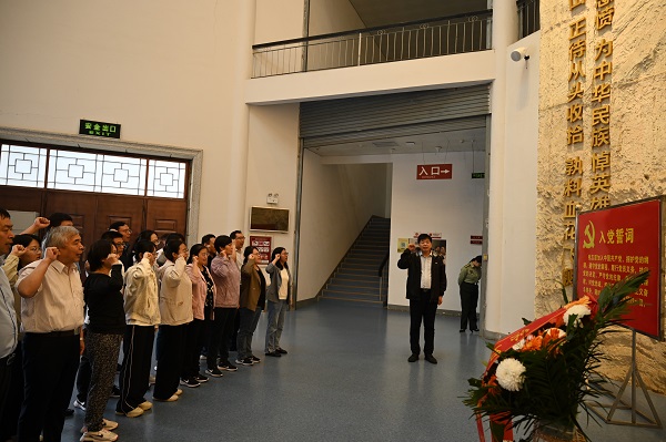 全体党员在党旗前庄严宣誓,重温入党誓词