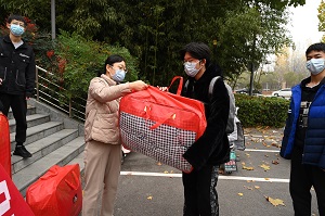 绅士漫画 副党委书记郭娟为学生分发棉被
