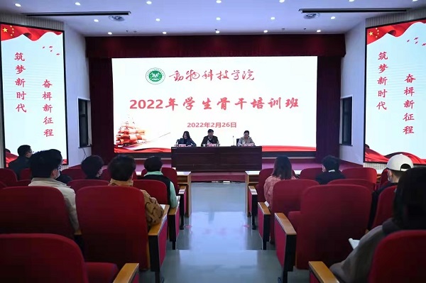 于2月26、27日举办了2022年学生骨干专题培训班。院党委书记贾磊、党委副书记郭娟、正科级组织员兼团委书记韩笑、团委副书记黄璞、兼职辅导员项玉强和全体学生骨干参加了培训班开班仪式。