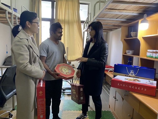 党委副书记郭娟、研究生导师史莹华一行来到学生宿舍,看望慰问在校巴基斯坦留学生阿里,为他送上节日的问候和新春的祝福。