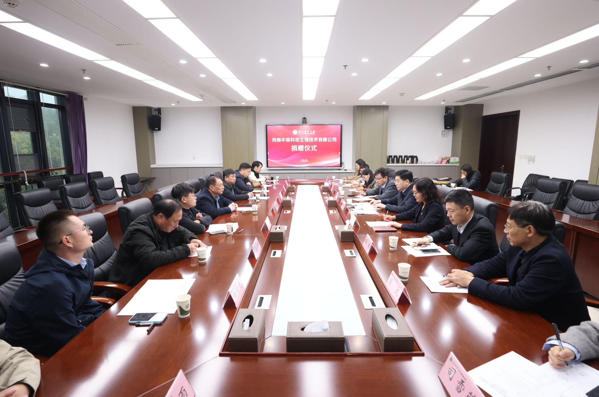郭战伟代表学校对原文浩一行表示欢迎,并对河南中原科地生物技术有限公司的捐赠表示感谢。他简要介绍了学校基本情况和近几年学校发展取得的成绩。他表示,为实现一流大学与一流企业的双向奔赴、融合创新,学校确立了“名校名企融合创新战略”,将校企合作作为推动教育链、人才链与产业链、创新链深度融合的核心路径,希望双方以此次捐赠为契机,依托“绅士漫画
