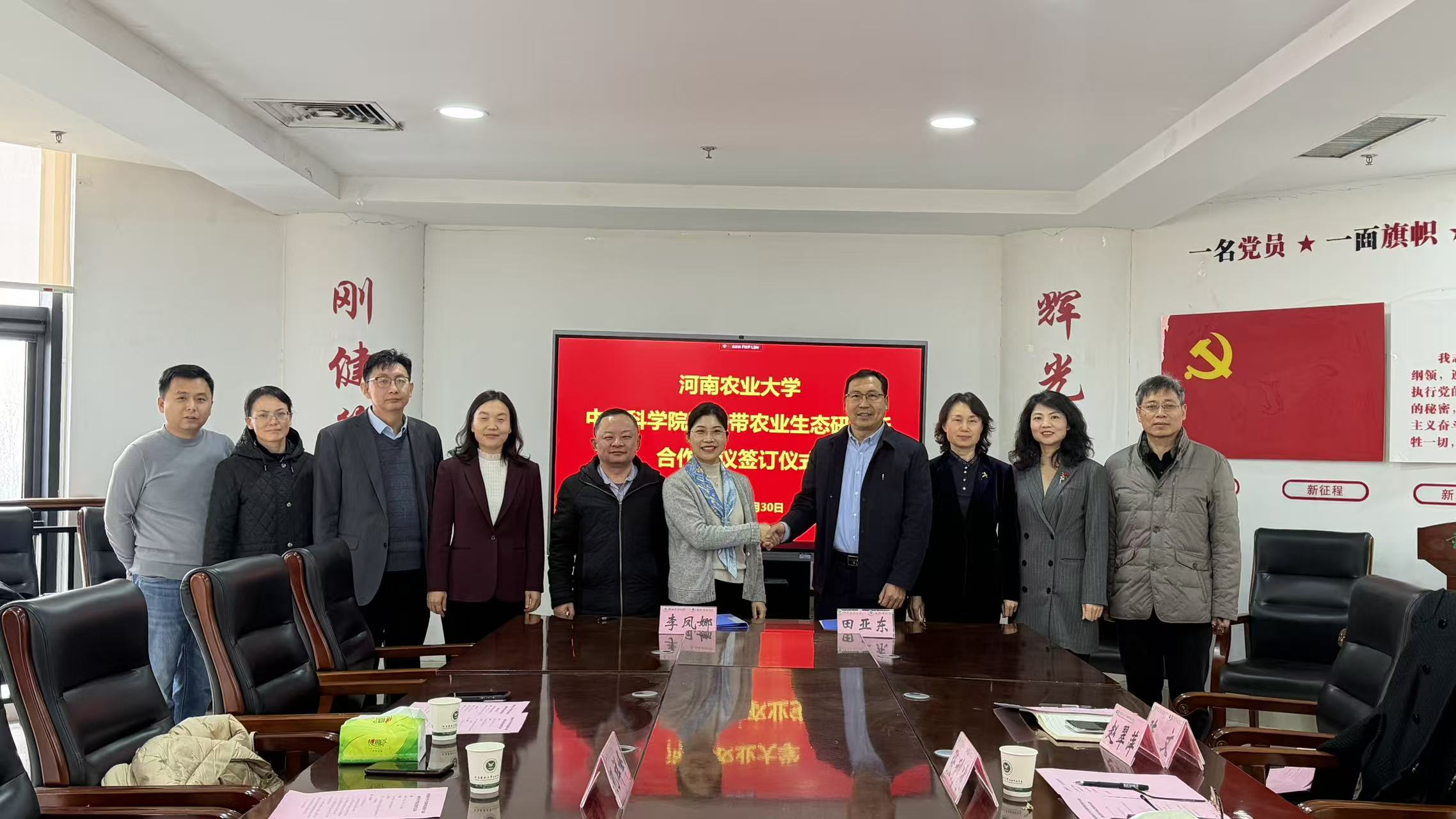 院长田亚东与中国科学院亚热带农业生态研究所畜禽健康养殖与农牧复合生态研究中心主任李凤娜代表双方签署了合作协议并合影留念。