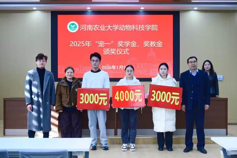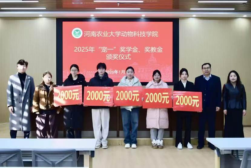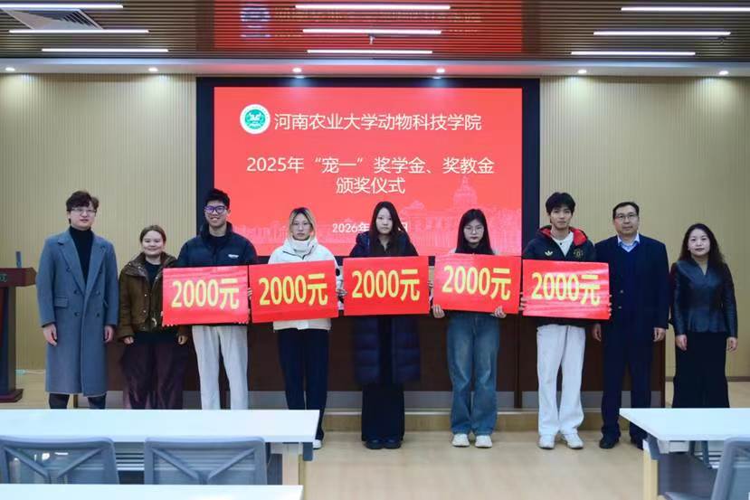 于龙子湖校区第一实验楼南508会议室举行2025年“宠一”奖学金、奖教金颁奖仪式。河南宠一生物科技有限公司创始人赵光彪、联合创始人刘琦、绅士漫画