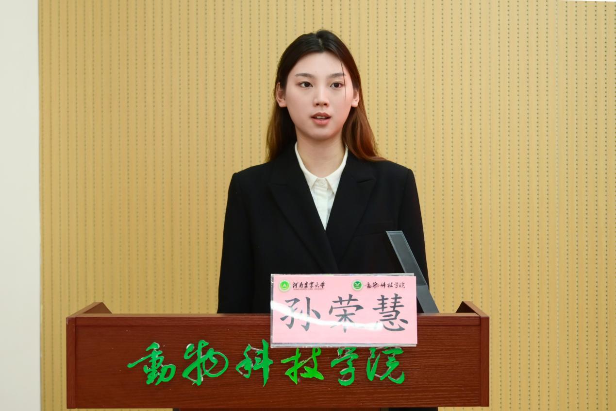 24级动物科学一班孙荣慧作为学生代表发言,她表示这份奖学金不仅是一份荣誉,更意味着一份责任,未来她将夯实专业基础、精进实践技能,深耕动物营养与饲料科学领域,以感恩之心践行青春之志,为行业发展与社会进步贡献青春力量。