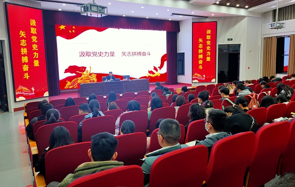 在龙子湖校区大教室一举行春季开学第一课暨党史学习教育动员大会,院党委书记贾磊做题为《汲取党史力量 矢志拼搏奋斗》的专题辅导报告。会议由院党委副书记郭娟主持,学院全体党员及入党积极分子参加大会。