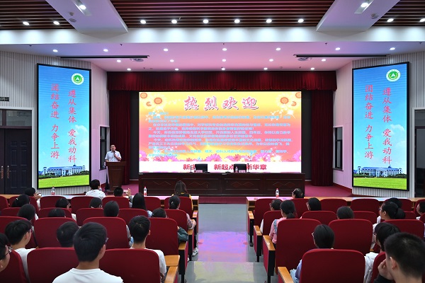 在教学楼大教室1举办2020级新生专业教育,动物生产与系统工程系教授田亚东以“爱学校 爱学院 爱专业”为主题带来一场生动的专业教育,院长李明、党委副书记郭娟、团委副书记韩笑、2020级班主任代表及全体新生参加活动,活动由韩笑主持。