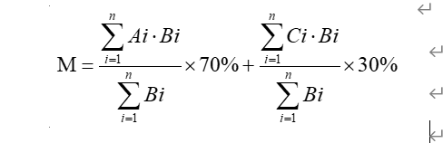 2、学习成绩(满分100分):以完成学校规定的培养方案获得的考核成绩为依据(英语成绩按第一学期计算),其中学位课程权重为70%,选修课权重为30%,具体计算公式如下: