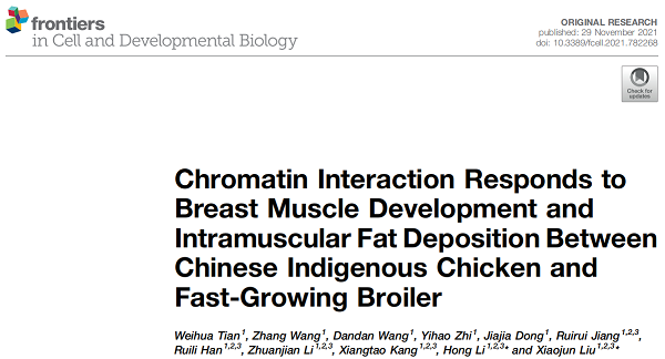 本网讯(通讯员 王章)11月29日,绅士漫画 家禽团队刘小军教授在Frontiers in Cell and Developmental Biology(IF=6.684)杂志上发表题为Chromatin Interaction Responds to Breast Muscle Development and Intramuscular Fat Deposition Between Chinese Indigenous Chicken and Fast-Growing Broiler的论文。文章通过比较地方品种卢氏鸡和快大型AA肉鸡在三维基因组结构上的差异,首次揭示了染色质拓扑结构域(TAD)变化对鸡肌纤维发育和肌内脂肪(IMF)沉积的影响。