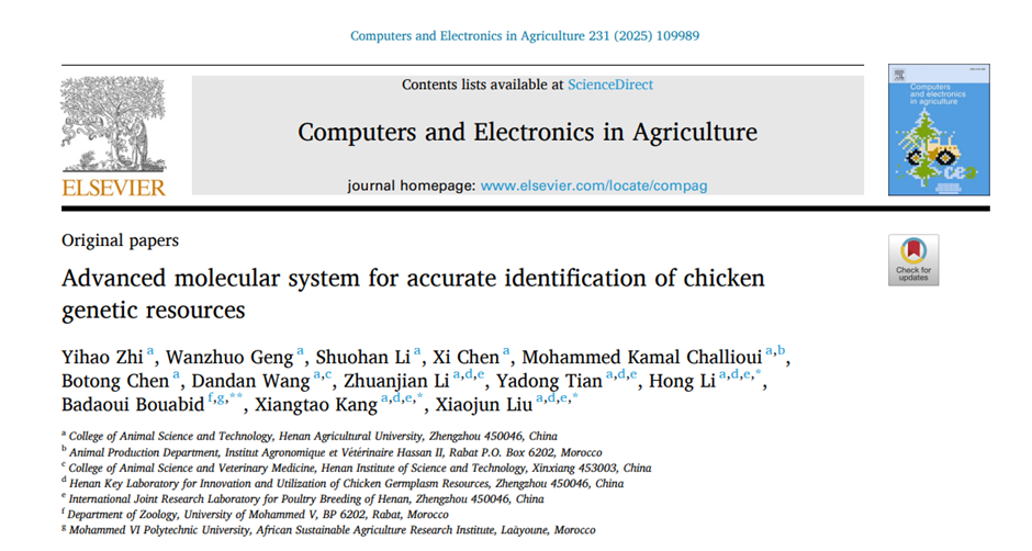 康相涛院士团队刘小军课题组在国际著名学术期刊《Computers and Electronics in Agriculture》在线发表了题为 “Advanced molecular system for accurate identification of chicken genetic resources 的研究论文。该研究成功开发了一种高效、准确的鸡种质资源分子鉴定系统,为鸡遗传资源的保护和利用提供了有力的技术支持。