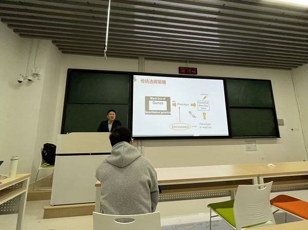 赵福平研究员首先详细地介绍了基因组选择的基本理论,内容丰富翔实,涵盖了基因组选择的基本流程、基因组育种值估计方法(如RR - BLUP、GBLUP、ssGBLUP等)的发展历程,以及基因组选择所具备的优势所在。紧接着,他又分别深入阐述了基因组选择在奶牛、猪、鸡和肉牛领域的应用现状、优势特点,并且对未来在各个领域面临的挑战与机遇也进行了细致剖析,让师生们对这一技术在不同畜牧领域的实际情况有了清晰的认知。