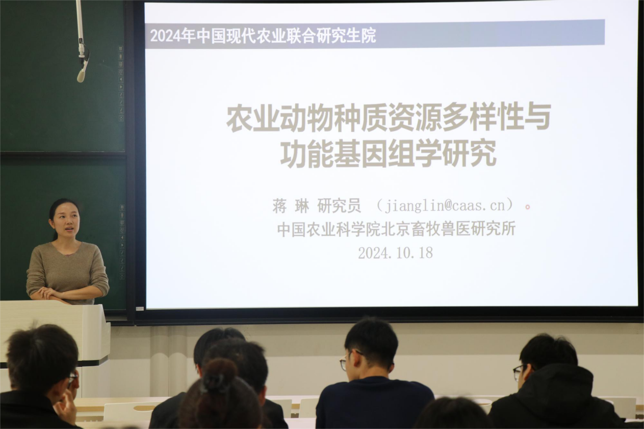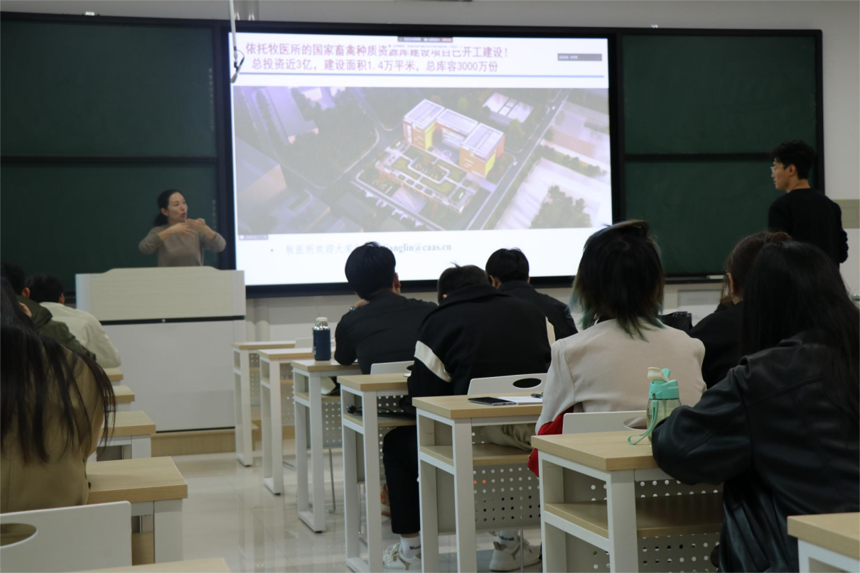 蒋琳研究员以《农业动物种质资源多样性与功能基因组学研究》为题。首先,引用习近平主席在全国十三届政协第五次会议的讲话:“种源安全关系到国家安全,必须下决心把我国种业搞上去,实现种业科技自立自强,种源安全可控”。简洁明了的交代了研究背景,使同学们了解到我国种业安全的重要性。随后,蒋琳研究员又阐述了畜禽是生物多样性研究的重要模型和畜禽遗传资源评价利用的最新进展,最后又与同学们分享了畜禽资源研究利用的经典思路并亲切的和同学们探讨畜禽评价利用的未来发展趋势。