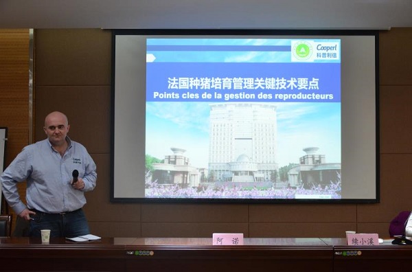Arnaud Hercé以“法国种猪培育管理关键技术要点”为主题,首先介绍了科普利信公司的发展历史、全产业链、动物福利及拥有的高新设备和技术,包括空气过滤站、曾祖代核心场、粪尿分离、猪只跟踪软件、液态饲料等。随后,Arnaud Hercé重点围绕如何确定母猪发情、查情的具体操作及配种的注意事项等详细讲解了公司生产系统中的后备母猪管理和查情公猪管理。最后,他还简要介绍了检测母猪尿液、定期更新后备、防范啮齿类动物及免疫计划等其他技术要点。