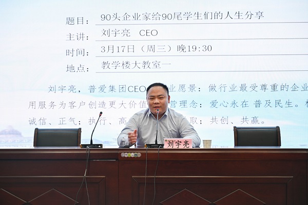 作为90后年轻企业家代表,刘宇亮以《90头企业家给90尾学生们的人生分享》为题,讲述了自身求学工作的经历,从在校期间、工作初期和企业未来规划三个方面分享了自己奋斗过程中的体会,他向同学们提出要努力勤奋、学好英语,遇到困难要学会坚持,为人处事真诚最重要,提早做好个人职业规划,职业生涯中不要频繁跳槽等意见和建议。