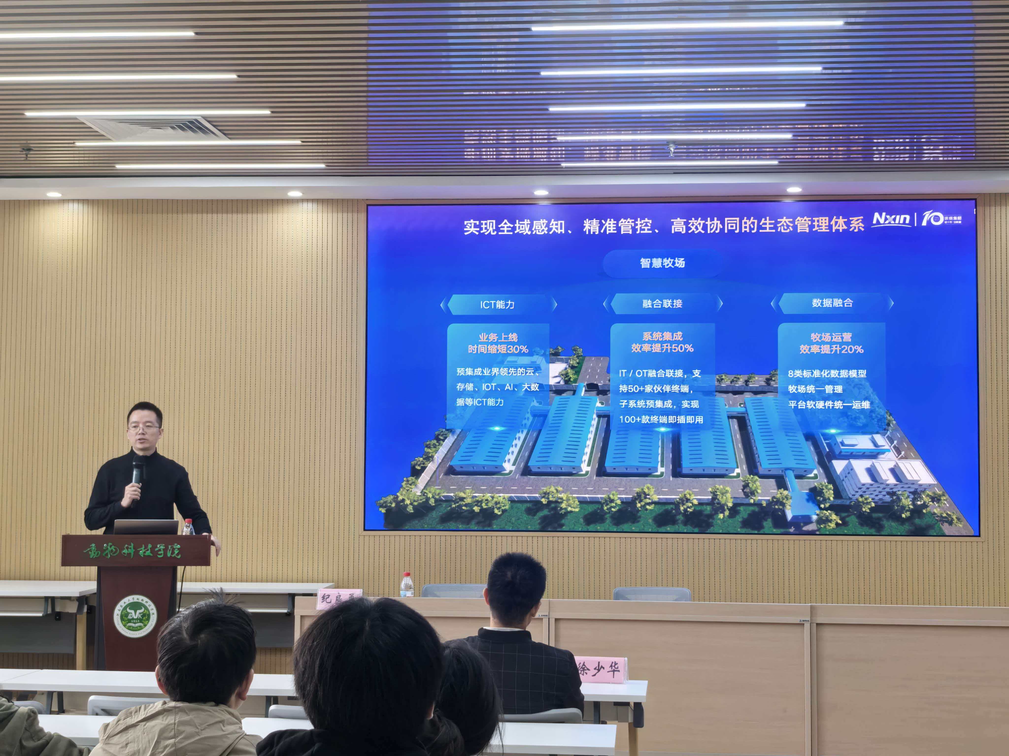 下午,纪良勇总经理为学院师生带来了第35期“笃实讲堂”的专题报告——“农信数智创新与实践”。纪良勇总经理以其在智慧农业方向应用研究和推广工作的丰富经验,深入浅出地阐述了农信数智如何通过物联网、大数据、人工智能、数字孪生等创新技术推动智慧牧场建设,并通过生动的案例,展示了农信数智在构建农业数智生态平台、服务生猪及其他涉农产业链方面的卓越成就。此外,纪良勇总经理全面介绍了农信一站式“教、学、创、赛”生态服务教育智能体平台——“学联网”,构建了公平、开放的面向未来教育的新生态。在互动环节,同学们积极提问,纪良勇先生耐心细致地解答了大家关于数智农业技术应用、产业发展趋势以及职业规划等方面的疑问。