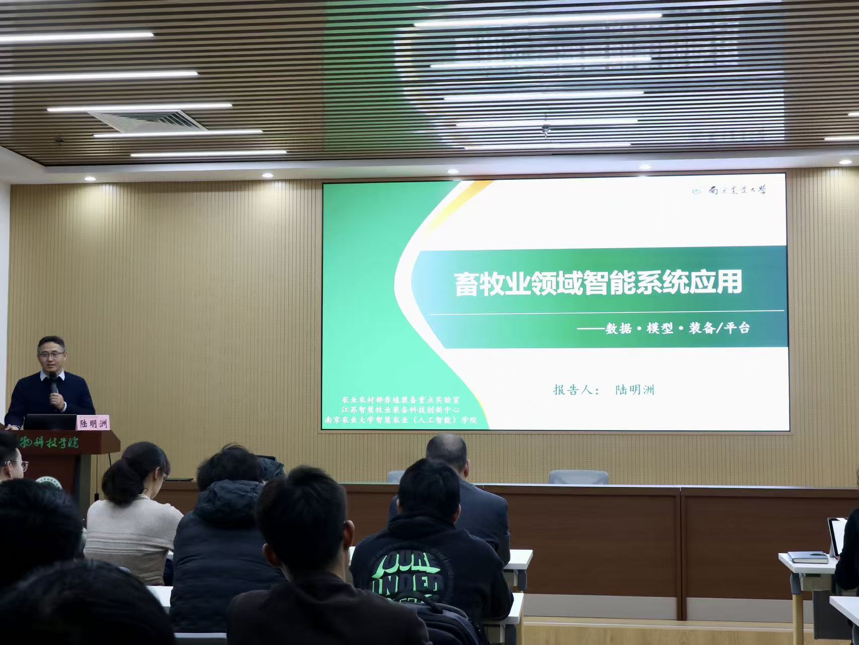 在龙子湖校区第一实验楼南508会议室举办第 206 期“日新论坛”学术交流活动。本次活动特邀南京农业大学陆明洲教授作《畜牧业领域的智能系统》专题报告,会议由副院长孙宇主持,牧原联合产业研究院副院长蒋瑞瑞,学院相关教师、研究生、智慧牧业与工程专业本科生等师生参会,同时本次论坛也吸引了来自机电工程学院、经济与管理学院和林学院的相关师生。