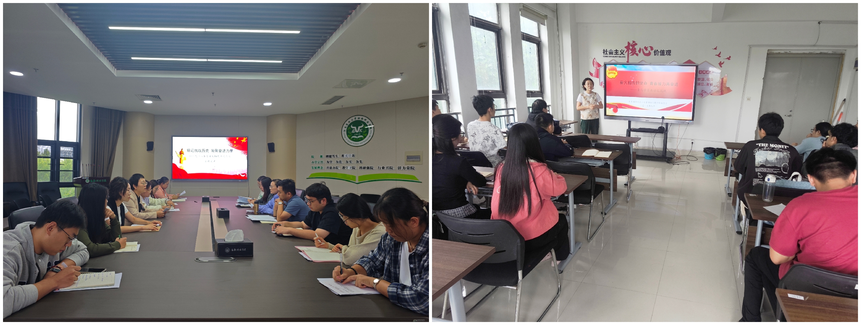 开展主题党、团课,强化使命担当。学院党委副书记郭娟在各支部党员代表中开展《铭记抗战历史 凝聚奋进力量》主题微党课,深刻阐释伟大抗战精神的时代价值,号召党员擦亮身份,赓续红色基因,将学习成效转化为岗位建功的强大动力。学院组织员兼团委书记韩笑开展主题团课,引导青年学子从历史中汲取“居安思危”的清醒、“团结奋斗”的信念以及“珍爱和平”的担当,坚持正确抗战史观、二战史观,坚定历史自信,以青春之我,筑强国之梦。