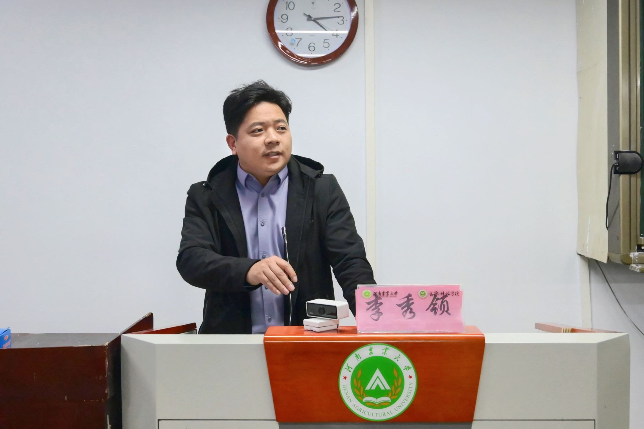 于桃李园学生公寓桃西楼204教室举办2025级动物生产类新生专业思想教育讲座。会议特邀海南省地方鸡产业技术体系首席科学家魏立民、水产与经济动物养殖系青年教师董鹏生主讲,2025级动物生产类专业全体本科生参加活动。活动由绅士漫画